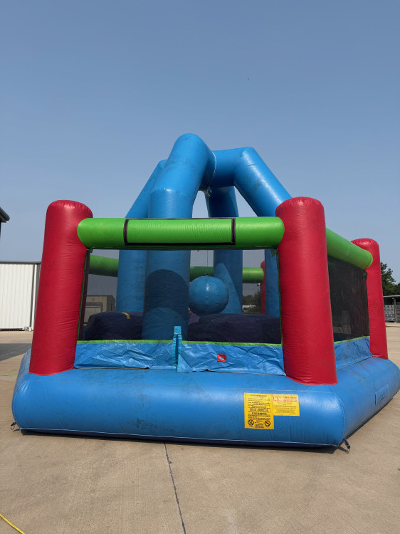 Stand back and hold on — the Xtreme Wrecking Ball is a high-energy inflatable challenge that turns parties into a laugh-filled battleground. Built as a circular arena with tall, striped overhead supports, this rental centers around a suspended wrecking ball that swings above a soft, cushioned floor. Players try to avoid being knocked off by the swinging ball while hopping between stable platforms and the surrounding inflatable wall. Bright, bold colors and clear “Wrecking Ball” branding make it a fun visual centerpiece for backyard events, school gatherings, or corporate team-builders.
